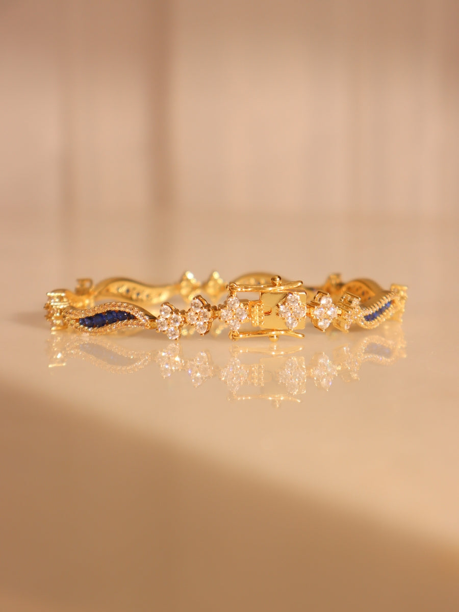A graceful blend of elegance and brilliance. Featuring delicate curves adorned with deep sapphire-toned stones and shimmering accents.