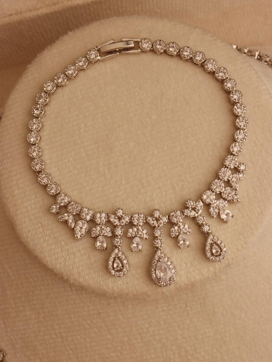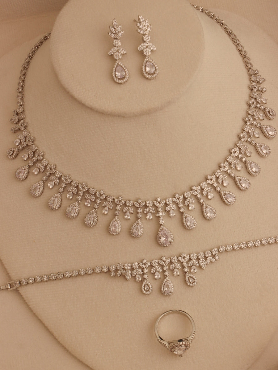 Capture the magic of a thousand sparkling stars with this breathtaking diamond-look jewelry set. Designed to make you feel like the radiant center of attention, this ensemble will leave a lasting impression on every special occasion. Let the intricate details and dazzling zircons tell your own unique story of elegance and sophistication. This is more than just jewelry; it's a piece of your heart, a treasure to cherish for a lifetime.