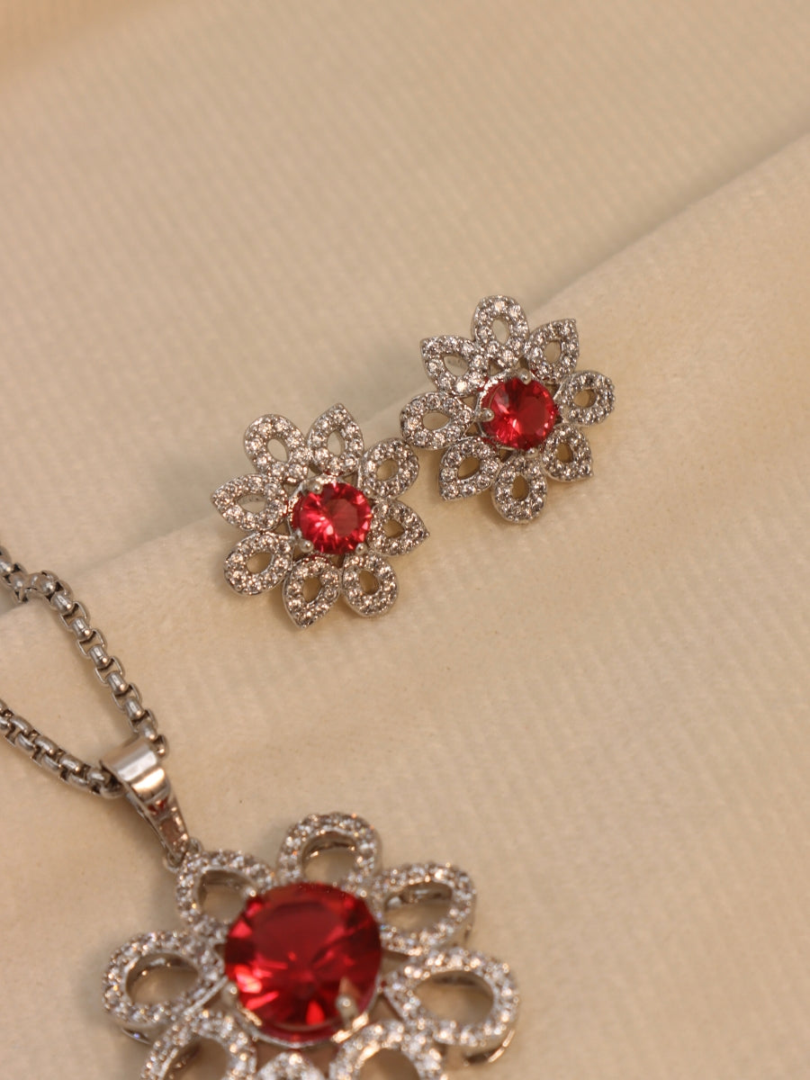 This intricate floral design with sparkling cubic zircons and a rich red zircon stone is a timeless piece that will elevate any outfit.